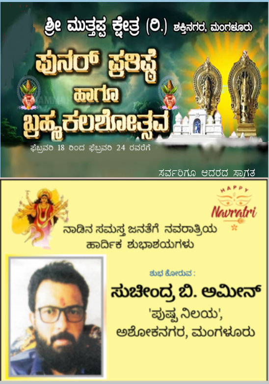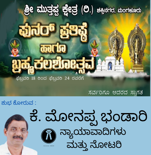 ಮಂಗಳೂರು,ಮಾ.06 : ಅಳಪೆ ಕಣ್ಣೂರಿನಲ್ಲಿರುವ ಶ್ರೀ ಮುಂಡಿತ್ತಾಯ ದೈವಸ್ಥಾನದ ಪುನಃ ಪ್ರತಿಷ್ಠಾ ಬ್ರಹ್ಮಕಲಶೋತ್ಸವ ಮತ್ತು ನೇಮೋತ್ಸವವು ಮಾರ್ಚ್ 10ರಿಂದ 15ರವರೆಗೆ…